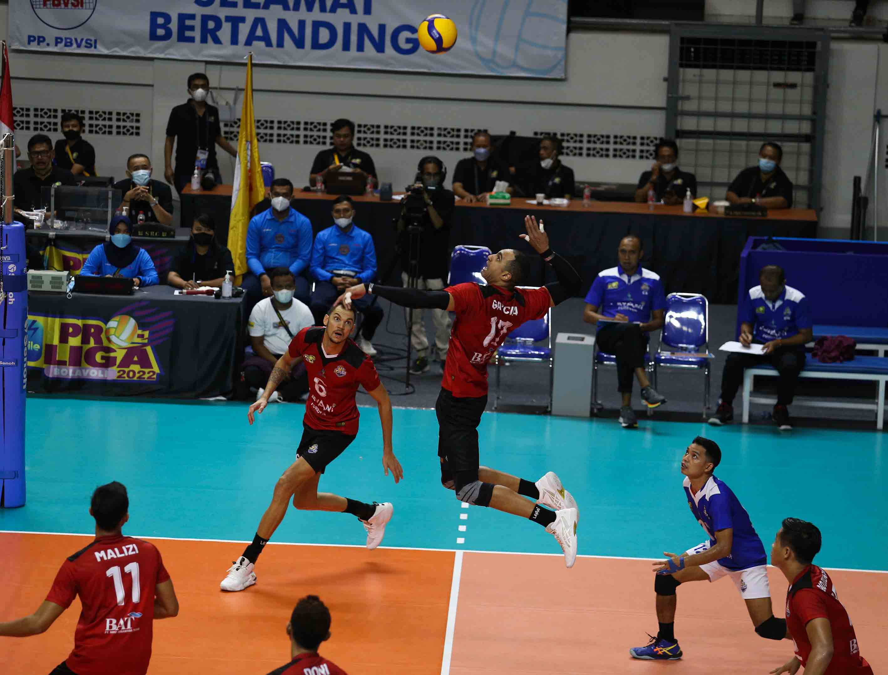 Jorge Gonzales Garcia (17) pemain bola voli Bogor Lavani mengarahkan pukulan smashnya ke area lawan. Bogor Lavani berhasil menang dari tim bola voli putra Jakarta BNI 46 dengan skor 3-1 (25-17, 21-25, 25-15, 25-16) pada Pertandingan Proliga 2022 putaran pertama yang berlangsung di GOR Padepokan Voli Jenderal Polisi Kunarto, Sentul, Minggu (23/1/2022). (Foto : Erly Bahtiar/Sportsmoment.id)