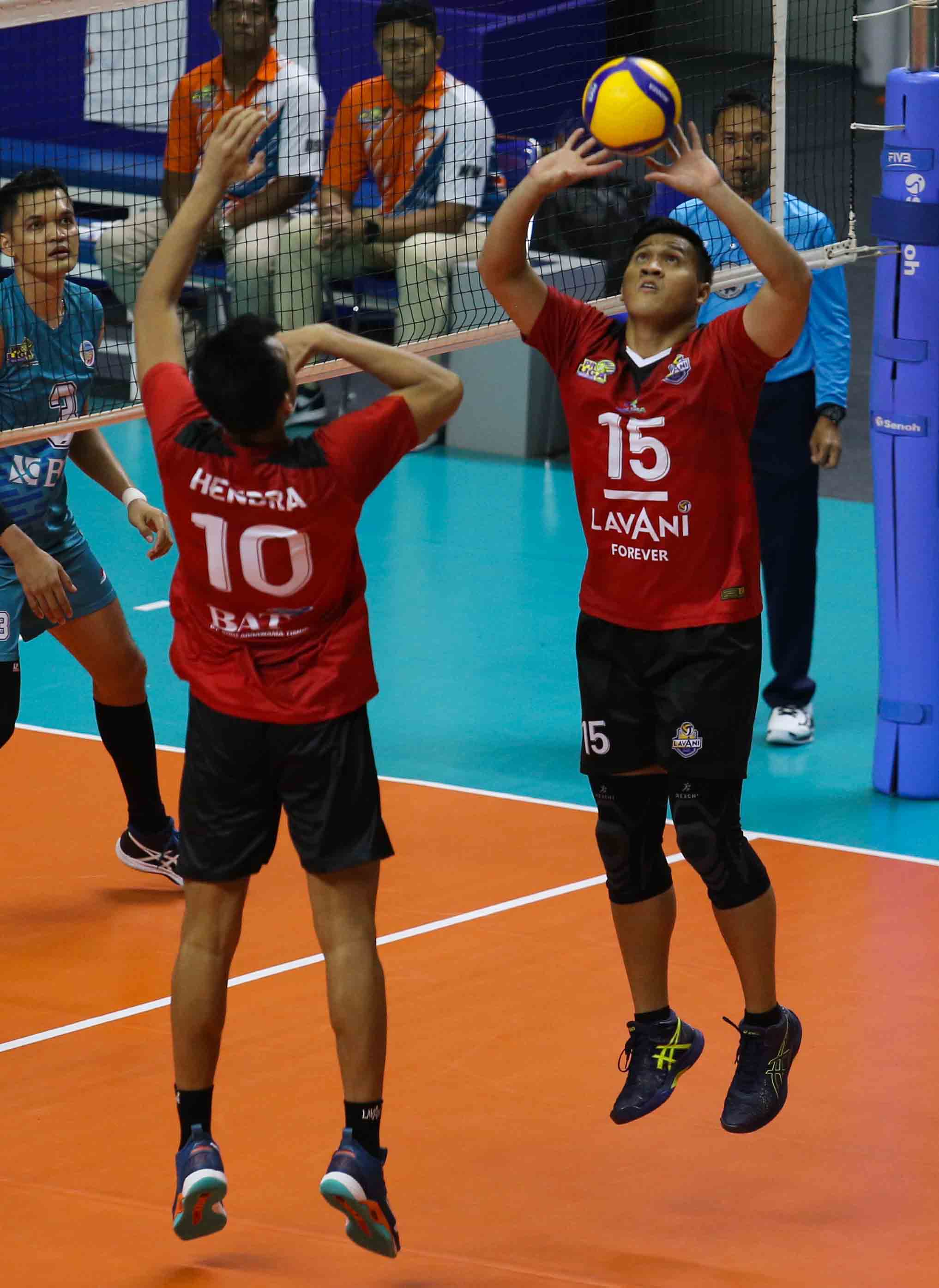 Dio Zulfikri (15) pemain bola voli Bogor Lavani memberikan umpan bola kepada rekannya. Bogor Lavani berhasil menang dari tim bola voli putra Jakarta BNI 46 dengan skor 3-1 (25-17, 21-25, 25-15, 25-16) pada Pertandingan Proliga 2022 putaran pertama yang berlangsung di GOR Padepokan Voli Jenderal Polisi Kunarto, Sentul, Minggu (23/1/2022). (Foto : Erly Bahtiar/Sportsmoment.id),,