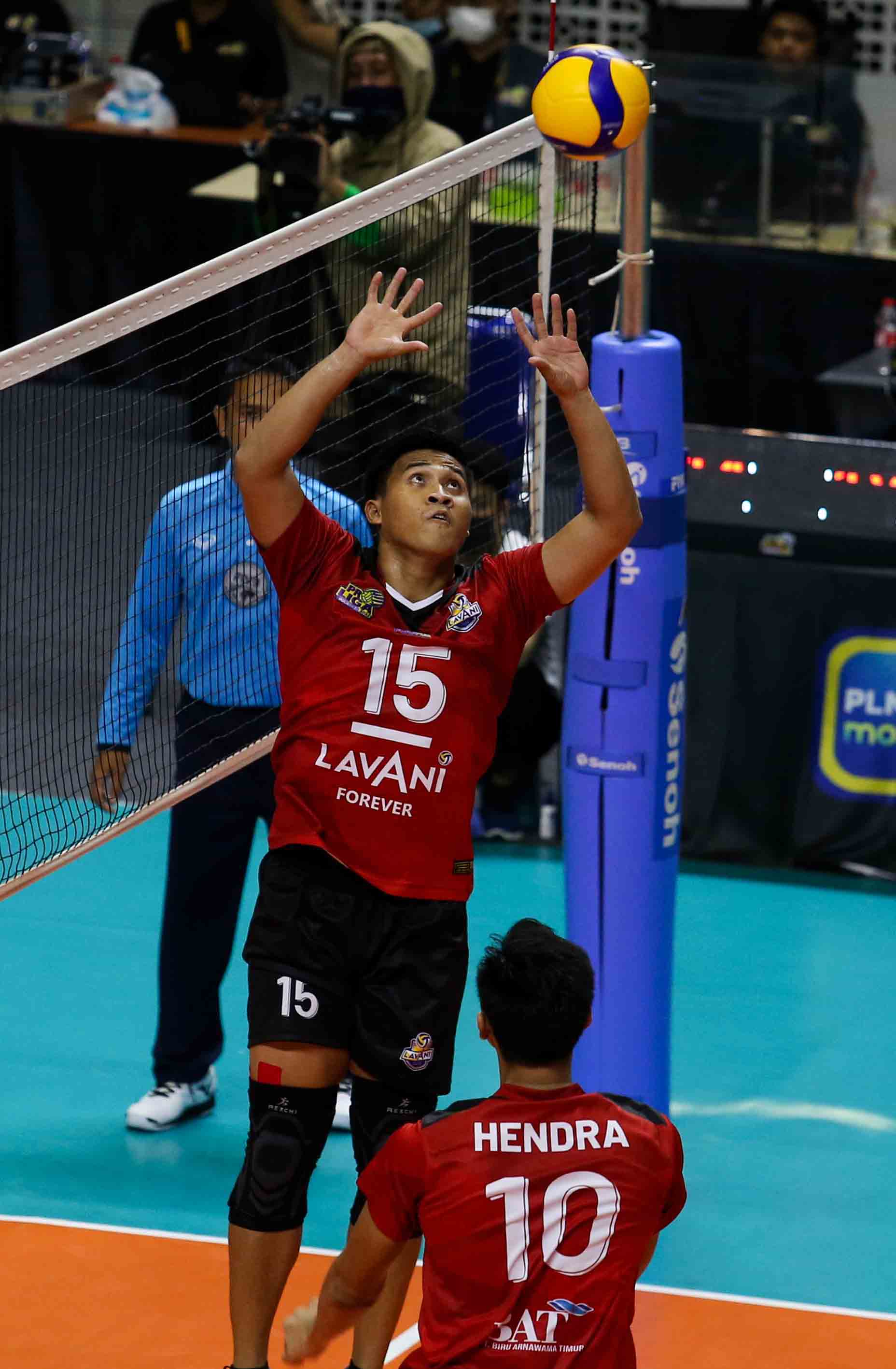 Dio Zulfikri (15) pemain bola voli Bogor Lavani memberikan umpan bola kepada rekannya. Bogor Lavani berhasil menang dari tim bola voli putra Jakarta BNI 46 dengan skor 3-1 (25-17, 21-25, 25-15, 25-16) pada Pertandingan Proliga 2022 putaran pertama yang berlangsung di GOR Padepokan Voli Jenderal Polisi Kunarto, Sentul, Minggu (23/1/2022). (Foto : Erly Bahtiar/Sportsmoment.id),,